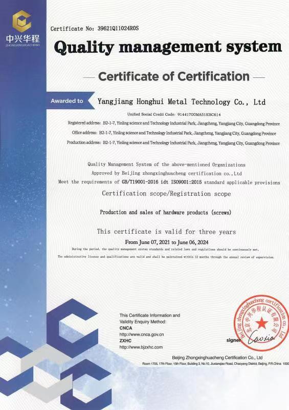 廣東宏惠金屬公司是家20多年一直專注鉆尾螺絲開發與生產的企業,是國內較早做鉆尾的廠家之一,同時也是國內專業開發生產鉆尾螺絲的企業之一。 我司地址為于廣東省陽江市江銀嶺科技園距沈海高速白沙出口不到2公里,距陽江高鐵站也只有十余公里交通便利。 公司占地120畝,擁有超500臺套專業設計 生產 檢測設備。一個超200人的專業團隊,能夠嚴格按照ISO9001質量體系要求生產符合GB DIN AS3566 ANSI JIS BS等標準的產品,生產銷售各種高品質緊固件系列產品,為中高端客戶提供優質服務。也可按照客戶要求設計生產各種鉆尾,年產高品質碳鋼 不銹鋼鉆尾螺絲2萬余噸.在各大客戶的鼎力支持下產品暢銷全國,并遠銷亞 非 拉 歐等地,在這20多年發展的道路上我司堅持“以質量求生存,以信譽求發展”的精神理念不斷完善公司體系。